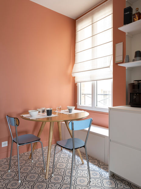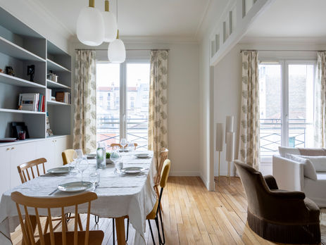 Du coté des matériaux, nous avons conversé le très beau parquet d'origine que nous avons associé avec des carreaux de ciment dans la cuisine et les WC invités, ce qui accentue le cachet de l'appartement.